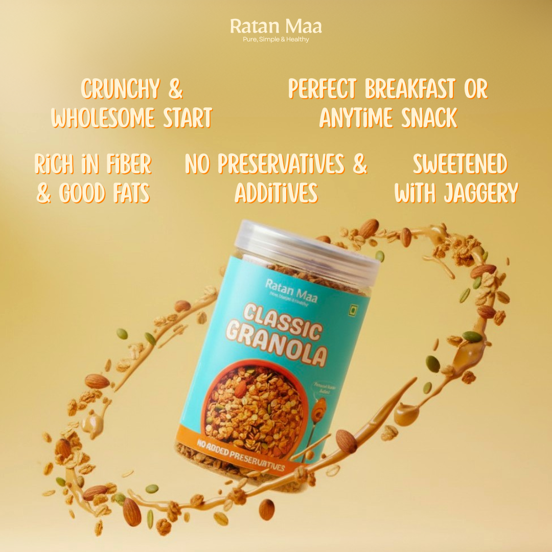 • Ratan Maa Classic Granola is a homemade, crunchy blend of oats, nuts, and seeds, crafted for balanced nutrition and everyday energy.