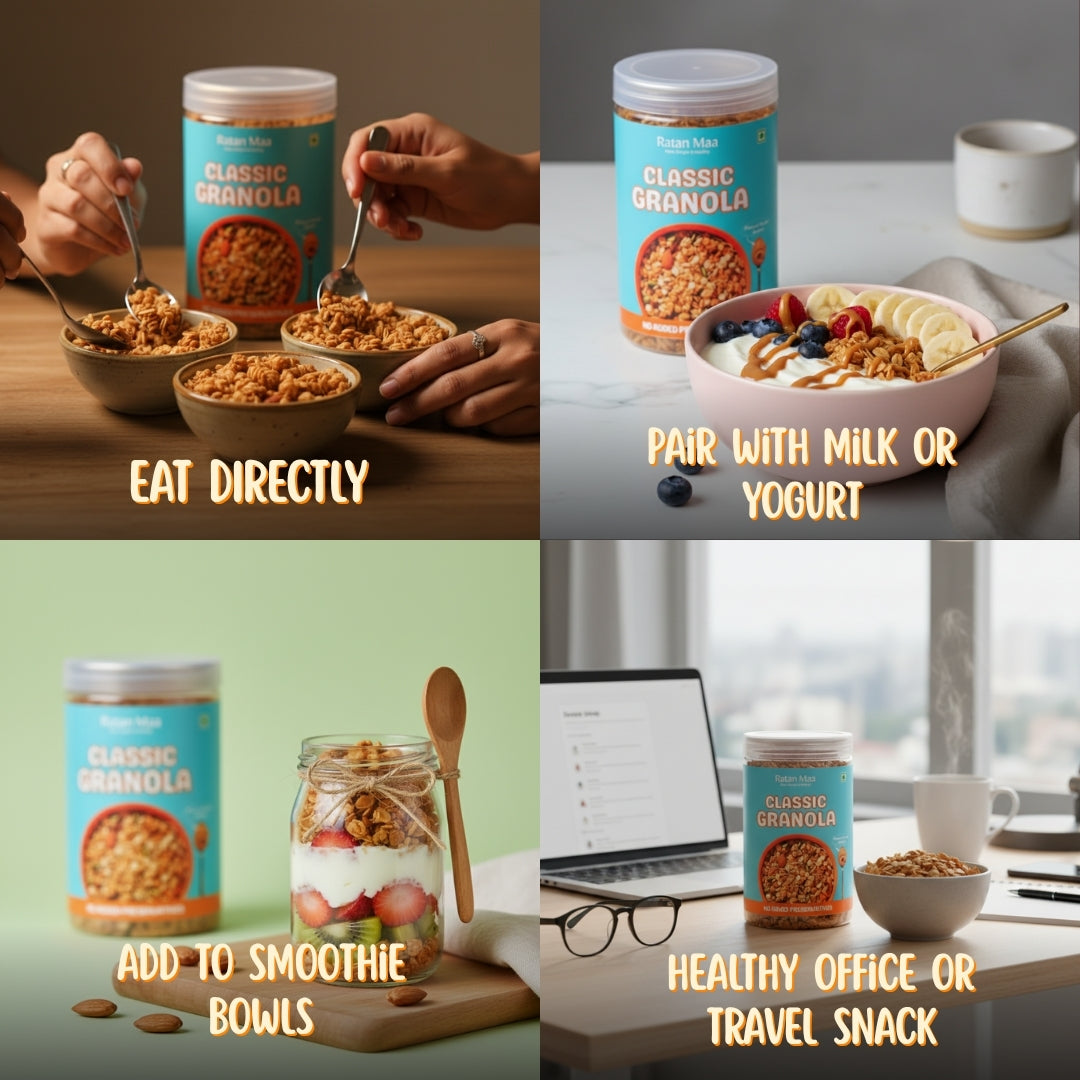 Ratanmaa Classic Granola brings you the wholesome crunch of oats, nuts, and seeds — crafted with pure, natural ingredients and no added preservatives. Lightly sweetened with jaggery and blended with creamy peanut butter, this granola delivers balanced nutrition + irresistible taste, making it perfect for both snacking and breakfast.
