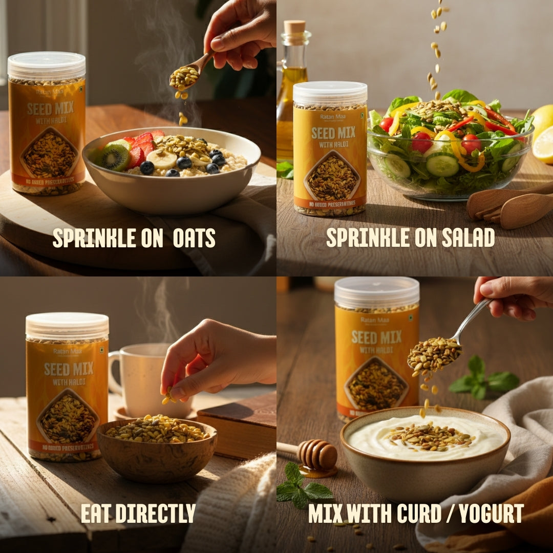 Ratanmaa's Seed Mix With Haldi ( Roasted & Salted ) are carefully crafted for those who want healthy snacking without compromising on taste. This premium mix combines nutrient-dense pumpkin, sunflower, and watermelon seeds, gently roasted to retain their natural goodness and lightly seasoned with turmeric and pink salt.