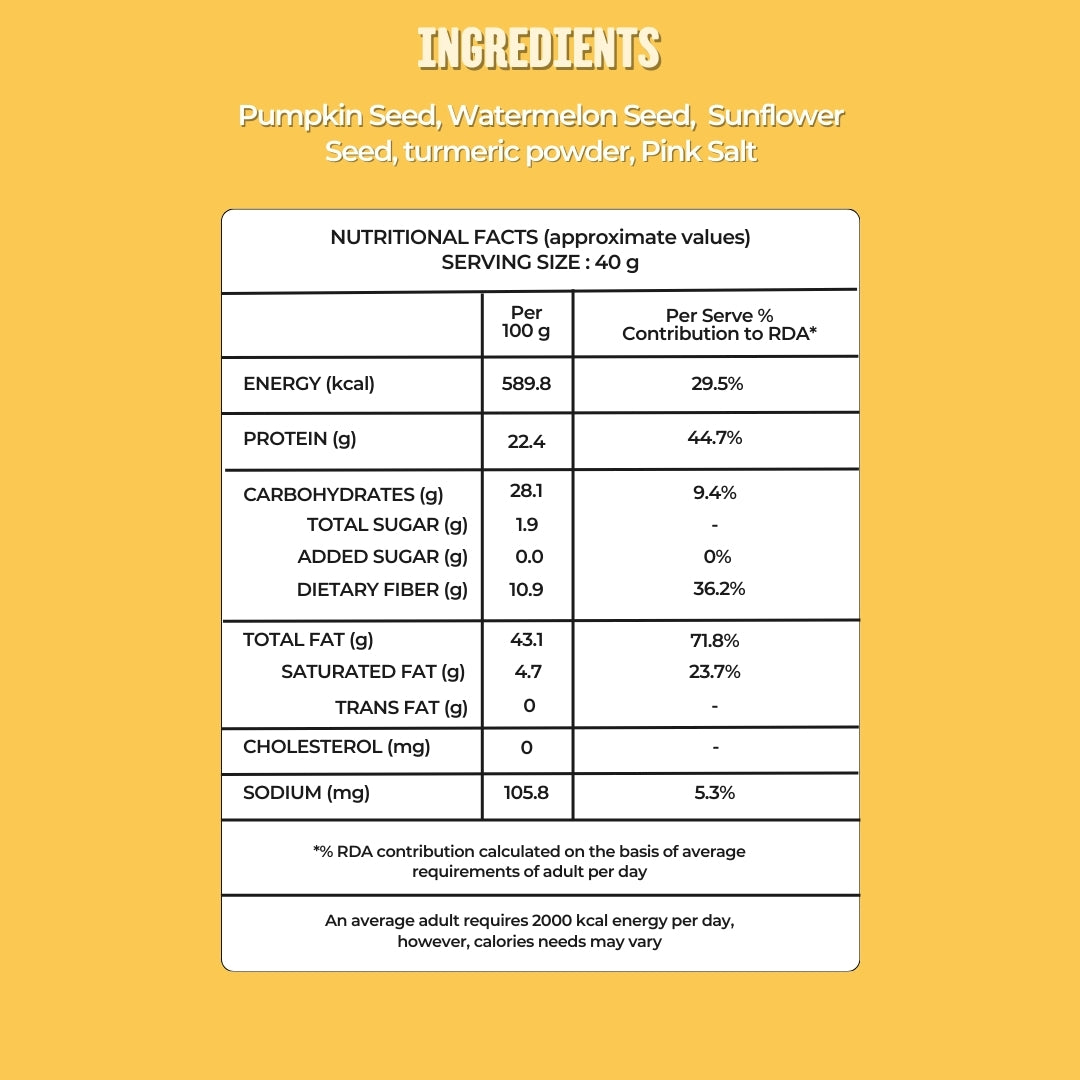 With high protein, dietary fiber, and essential minerals like iron and calcium, this seed mix helps keep you energized, supports digestion, and curbs unhealthy cravings. Free from added sugar, preservatives, and artificial ingredients, it’s a smart everyday snack for fitness enthusiasts, working professionals, and health-conscious families.